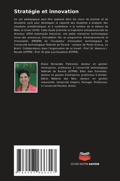 Ce cas pédagogique peut être appliqué dans les cours de premier et de deuxième cycle pour développer la capacité des étudiants à analyser des situations problématiques et à synthétiser à la lumière de la théorie de Miles et Snow (1978). Cette étude présente la trajectoire entrepreneuriale du directeur d'EXA Automação Industrial, une petite entreprise technologique issue des processus d'incubation liés au programme d'entrepreneuriat et d'innovation (PROEM) de l'incubateur d'innovation technologique de l'université technologique fédérale de Paraná - campus de Ponta Grossa, au Brésil. Collaborateurs dans l'organisation de ce travail : Prof. Dr. Vanessa I. Rasoto (UTFPR) ; Prof. Dr João Luiz Kovaleski (UTFPR).