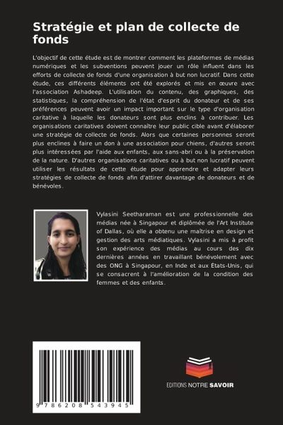 L'objectif de cette étude est de montrer comment les plateformes de médias numériques et les subventions peuvent jouer un rôle influent dans les efforts de collecte de fonds d'une organisation à but non lucratif. Dans cette étude, ces différents éléments ont été explorés et mis en oeuvre avec l'association Ashadeep. L'utilisation du contenu, des graphiques, des statistiques, la compréhension de l'état d'esprit du donateur et de ses préférences peuvent avoir un impact important sur le type d'organisation caritative à laquelle les donateurs sont plus enclins à contribuer. Les organisations caritatives doivent connaître leur public cible avant d'élaborer une stratégie de collecte de fonds. Alors que certaines personnes seront plus enclines à faire un don à une association pour chiens, d'autres seront plus intéressées par l'aide aux enfants, aux sans-abri ou à la préservation de la nature. D'autres organisations caritatives ou à but non lucratif peuvent utiliser les résultats de cette étude pour apprendre et adapter leurs stratégies de collecte de fonds afin d'attirer davantage de donateurs et de bénévoles.