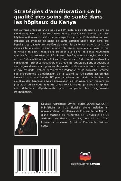 Cet ouvrage présente une étude sur l'efficacité des stratégies de soins de santé de qualité dans l'amélioration de la prestation de services dans les hôpitaux nationaux de référence au Kenya. Le système d'orientation du pays implique un système de soins de santé complet utilisé pour gérer les besoins des patients en matière de soins de santé en les orientant d'un niveau inférieur vers un établissement de niveau supérieur qui peut fournir le niveau de soins nécessaire ou pour des soins de santé hautement spécialisés. Les résultats de l'étude ont révélé que les stratégies de soins de santé de qualité ont un effet positif sur la qualité des services dans les hôpitaux de référence nationaux, mais que les stratégies sont associées à des degrés divers aux systèmes de prestation de services, aux processus et aux résultats. L'étude recommande l'adoption d'une approche intégrée des programmes d'amélioration de la qualité et l'utilisation accrue des innovations en matière de TIC pour améliorer les délais d'exécution. La direction des hôpitaux devrait encourager les innovations en matière de prestation de services dans les unités fonctionnelles qui sont appropriées aux différents départements pour compléter les programmes institutionnels.