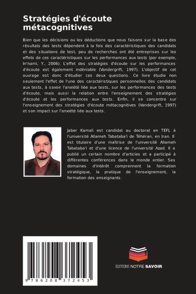 Bien que les décisions ou les déductions que nous faisons sur la base des résultats des tests dépendent à la fois des caractéristiques des candidats et des situations de test, peu de recherches ont été entreprises sur les effets de ces caractéristiques sur les performances aux tests (par exemple, In'nami, Y., 2006). L'effet des stratégies d'écoute sur les performances d'écoute est également indéniable (Vandergrift, 1997). L'objectif de cet ouvrage est donc d'étudier ces deux questions. Ce livre étudie non seulement l'effet de l'une des caractéristiques personnelles des candidats aux tests, à savoir l'anxiété liée aux tests, sur les performances des tests d'écoute, mais aussi la relation entre l'enseignement des stratégies d'écoute et les performances aux tests. Enfin, il se concentre sur l'enseignement des stratégies d'écoute métacognitives (Vandergrift, 1997) et son impact sur l'anxiété liée aux tests.