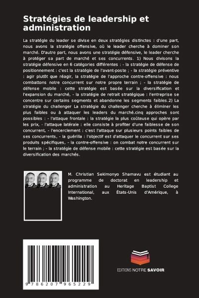 La stratégie du leader se divise en deux stratégies distinctes : d'une part, nous avons la stratégie offensive, où le leader cherche à dominer son marché. D'autre part, nous avons une stratégie défensive, le leader cherche à protéger sa part de marché et ses concurrents. 1) Nous divisons la stratégie défensive en 6 catégories différentes : - la stratégie de défense de positionnement : c'est la stratégie de l'avant-poste ; - la stratégie préventive : agir plutôt que réagir, la stratégie de l'approche contre-offensive : nous combattons notre concurrent sur notre propre terrain ; - la stratégie de défense mobile : cette stratégie est basée sur la diversification et l'expansion du marché, - la stratégie de retrait stratégique : l'entreprise se concentre sur certains segments et abandonne les segments faibles.2) La stratégie du challenger La stratégie du challenger cherche à éliminer les plus faibles ou à attaquer les leaders du marché.cinq approches sont possibles : - l'attaque frontale : la stratégie la plus coûteuse qui opère par les prix, - l'attaque latérale : elle consiste à profiter d'une faiblesse de son concurrent, - l'encerclement : c'est l'attaque sur plusieurs points faibles de ses concurrents, - la guérilla : l'objectif est d'attaquer le concurrent sur ses produits spécifiques, - la contre-offensive : on combat notre concurrent sur le terrain ; - la stratégie de défense mobile : cette stratégie est basée sur la diversification des marchés.