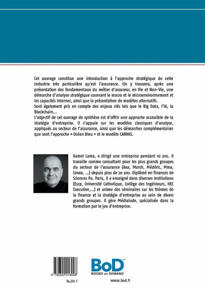 L'assurance est une activité très ancienne et essentielle au fonctionnement de nos sociétés. Pourtant, c'est un secteur économique qui reste relativement méconnu du grand public en raison de sa complexité. Cet ouvrage constitue une introduction à l'approche stratégique de cette industrie si particulière et néanmoins passionnante. On y trouvera, après une présentation des fondamentaux du métier d'assureur, en Vie et Non Vie, une démarche d'analyse stratégique couvrant le macro-environnement, le micro-environnement ainsi que les capacités internes de la Firme. A cela s'ajoute la présentation de modèles alternatifs d'analyse, ainsi que la prise en compte d'enjeux clés tels que le Big Data, l'IA, la Blockchain, etc. L'objectif de cet ouvrage de synthèse est d'offrir une approche pédagogique de la stratégie d'entreprise appliquée au secteur de l'assurance. Il permet de découvrir les modèles classiques d'analyse ainsi que quelques approches plus récentes.