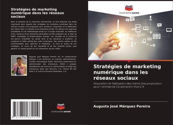 Dans le domaine de la recherche commerciale, ce livre présente une étude importante dans laquelle des stratégies de marketing numérique dans les réseaux sociaux sont proposées pour améliorer l'acquisition et la fidélisation des clients dans le contexte d'une entreprise privée. En utilisant une approche quantitative et une méthodologie basée sur un projet réalisable, les faiblesses et les menaces d'une entreprise particulière ont été analysées par le biais de SWOT, d'enquêtes et d'observations directes. Les résultats de la recherche ont permis d'identifier les points forts et les domaines à améliorer, en soulignant la faible activité des outils numériques. Des actions viables ont été recommandées pour optimiser le marketing ; la mise en oeuvre de ces stratégies, en raison de leur faisabilité et de leur potentiel élevés, peut générer un impact positif sur les entreprises qui les relient.