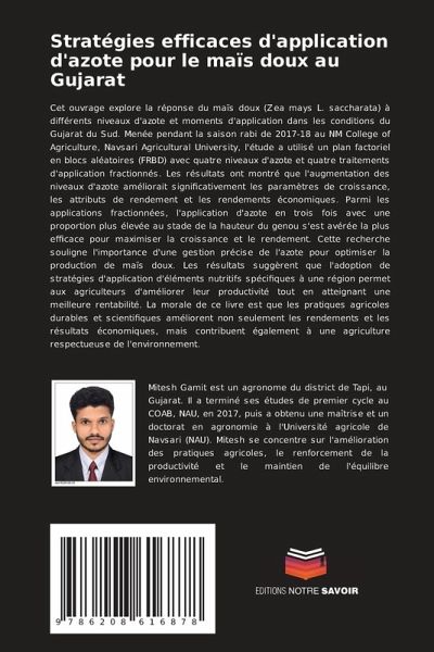 Cet ouvrage explore la réponse du maïs doux (Zea mays L. saccharata) à différents niveaux d'azote et moments d'application dans les conditions du Gujarat du Sud. Menée pendant la saison rabi de 2017-18 au NM College of Agriculture, Navsari Agricultural University, l'étude a utilisé un plan factoriel en blocs aléatoires (FRBD) avec quatre niveaux d'azote et quatre traitements d'application fractionnés. Les résultats ont montré que l'augmentation des niveaux d'azote améliorait significativement les paramètres de croissance, les attributs de rendement et les rendements économiques. Parmi les applications fractionnées, l'application d'azote en trois fois avec une proportion plus élevée au stade de la hauteur du genou s'est avérée la plus efficace pour maximiser la croissance et le rendement. Cette recherche souligne l'importance d'une gestion précise de l'azote pour optimiser la production de maïs doux. Les résultats suggèrent que l'adoption de stratégies d'application d'éléments nutritifs spécifiques à une région permet aux agriculteurs d'améliorer leur productivité tout en atteignant une meilleure rentabilité. La morale de ce livre est que les pratiques agricoles durables et scientifiques améliorent non seulement les rendements et les résultats économiques, mais contribuent également à une agriculture respectueuse de l'environnement.