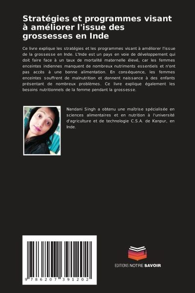 Ce livre explique les stratégies et les programmes visant à améliorer l'issue de la grossesse en Inde. L'Inde est un pays en voie de développement qui doit faire face à un taux de mortalité maternelle élevé, car les femmes enceintes indiennes manquent de nombreux nutriments essentiels et n'ont pas accès à une bonne alimentation. En conséquence, les femmes enceintes souffrent de malnutrition et donnent naissance à des enfants présentant de nombreux problèmes. Ce livre explique également les besoins nutritionnels de la femme pendant la grossesse.