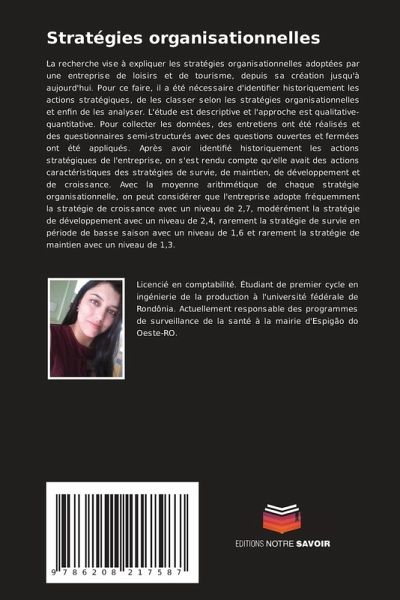 La recherche vise à expliquer les stratégies organisationnelles adoptées par une entreprise de loisirs et de tourisme, depuis sa création jusqu'à aujourd'hui. Pour ce faire, il a été nécessaire d'identifier historiquement les actions stratégiques, de les classer selon les stratégies organisationnelles et enfin de les analyser. L'étude est descriptive et l'approche est qualitative-quantitative. Pour collecter les données, des entretiens ont été réalisés et des questionnaires semi-structurés avec des questions ouvertes et fermées ont été appliqués. Après avoir identifié historiquement les actions stratégiques de l'entreprise, on s'est rendu compte qu'elle avait des actions caractéristiques des stratégies de survie, de maintien, de développement et de croissance. Avec la moyenne arithmétique de chaque stratégie organisationnelle, on peut considérer que l'entreprise adopte fréquemment la stratégie de croissance avec un niveau de 2,7, modérément la stratégie de développement avec un niveau de 2,4, rarement la stratégie de survie en période de basse saison avec un niveau de 1,6 et rarement la stratégie de maintien avec un niveau de 1,3.