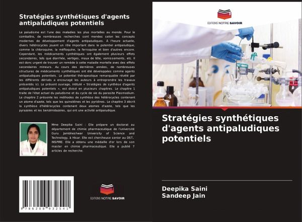 Le paludisme est l'une des maladies les plus mortelles au monde. Pour le combattre, de nombreuses recherches sont menées selon les concepts modernes de développement d'agents antipaludiques. À l'heure actuelle, divers hétérocycles jouent un rôle important dans le potentiel antipaludique, comme la chloroquine, la méfloquine, la ferroquine et bien d'autres encore. Cependant, les médicaments synthétiques ont également plusieurs effets secondaires, tels que diarrhée, vertiges, maux de tête, vomissements, etc. Il est donc urgent de trouver un remède à cette maladie mortelle avec des effets secondaires mineurs. Au cours des dernières années, de nombreuses structures de médicaments synthétiques ont été développées comme agents antipaludiques potentiels. Le potentiel thérapeutique remarquable révélé par les différents dérivés a encouragé les auteurs à entreprendre les travaux présentés ici. Le présent ouvrage, intitulé « Stratégies de synthèse d'agents antipaludiques potentiels », est divisé en plusieurs chapitres. Le chapitre 1 traite de l'état actuel du paludisme et du cycle de vie du parasite Plasmodium. Le chapitre 2 présente les méthodes de synthèse des hétérocycles contenant un atome d'azote, tels que les quinoléines et les pyridines. Le chapitre 3 décrit la synthèse d'hétérocycles contenant deux atomes d'azote, tels que les pyrazoles et les benzimidazoles, qui ont une activité antipaludique.
