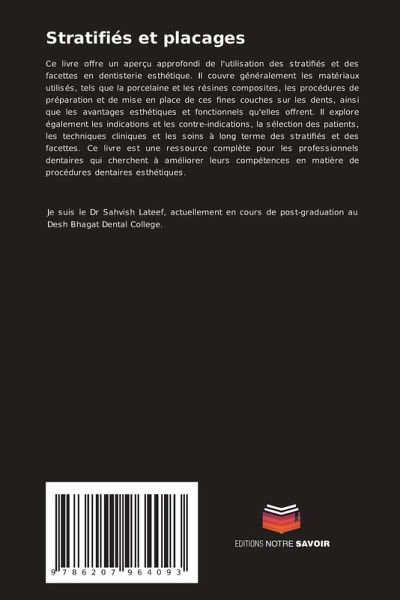Ce livre offre un aperçu approfondi de l'utilisation des stratifiés et des facettes en dentisterie esthétique. Il couvre généralement les matériaux utilisés, tels que la porcelaine et les résines composites, les procédures de préparation et de mise en place de ces fines couches sur les dents, ainsi que les avantages esthétiques et fonctionnels qu'elles offrent. Il explore également les indications et les contre-indications, la sélection des patients, les techniques cliniques et les soins à long terme des stratifiés et des facettes. Ce livre est une ressource complète pour les professionnels dentaires qui cherchent à améliorer leurs compétences en matière de procédures dentaires esthétiques.