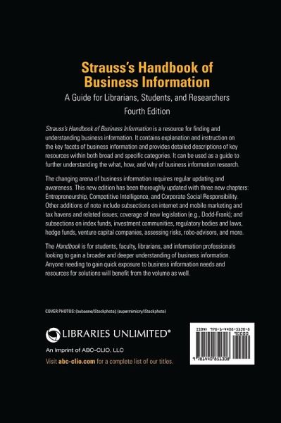 This new edition of Strauss's guide helps users to find current information for and about businesses of all kinds-both private and public, U.S.-based and international-related to finance, investment, industries, and entrepreneurship. Strauss's Handbook of Business Information is a resource for finding and understanding business information. It contains explanation and instruction on the key facets of business information and provides detailed descriptions of key resources within both broad and specific categories. It can be used as a guide to further understanding the what, how, and why of business information research. The changing arena of business information requires regular updating and awareness. This new edition has been thoroughly updated with three new chapters: Entrepreneurship, Competitive Intelligence, and Corporate Social Responsibility. Other additions of note include subsections on internet and mobile marketing and tax havens and related issues; coverage of new legislation (e.g., Dodd-Frank); and subsections on index funds, investment communities, regulatory bodies and laws, hedge funds, venture capital companies, assessing risks, robo-advisors, and more. The Handbook is for students, faculty, librarians, and information professionals looking to gain a broader and deeper understanding of business information. Anyone needing to gain quick exposure to business information needs and resources for solutions will benefit from the volume as well.