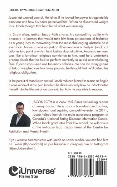 Jacob just wanted control. He felt as if he lacked the power to regulate his emotions and how his peers perceived him. When he discovered weight loss, Jacob thought that hed found what was missing. In Straw Man, author Jacob Roth shares his compelling battle with anorexia, a journey that would take him from perceptions of isolation as a young boy to recovering from the most challenging obstacle hed ever face. Anorexia was not just an illnessit was a lifestyle. Jacob cut calories to a point at which hed fast for days at a time. Anorexia nervosa was like a fanatical religious conviction to him, and hed undertake precise rituals that he had to perform correctly to avoid overwhelming fear. If Jacob consumed one too many calories, ate one too many grams of fat, or weighed one too many pounds, he thought that hed defied his religious obligation. In the pursuit of that elusive control, Jacob reduced himself to a man as fragile as one made of straw. Join Jacob as he shares not only how he indoctrinated himself into the lifestyle of an anorexic but how he was able to recover.