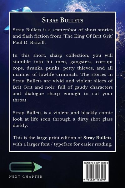 Stray Bullets is a scattershot of short stories and flash fiction from 'The King Of Brit Grit' Paul D. Brazill. In this short, sharp collection, you will stumble into hit men, gangsters, corrupt cops, drunks, punks, petty thieves, and all manner of lowlife criminals. The stories in Stray Bullets are vivid and violent slices of Brit Grit and noir, full of gaudy characters and dialogue sharp enough to cut your throat. Stray Bullets is a violent and blackly comic look at life seen through a dirty shot glass darkly. This is the large print edition of Stray Bullets, with a larger font / typeface for easier reading.