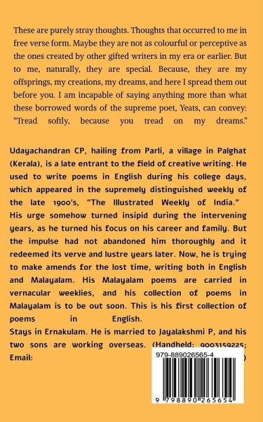 These are purely stray thoughts. Thoughts that occurred to me in free verse form. Maybe they are not as colourful or perceptive as the ones created by other gifted writers in my era or earlier. But to me, naturally, they are special. Because, they are my offsprings, my creations, my dreams, and here I spread them out before you. I am incapable of saying anything more than what these borrowed words of the supreme poet, Yeats, can convey: "Tread softly, because you tread on my dreams."