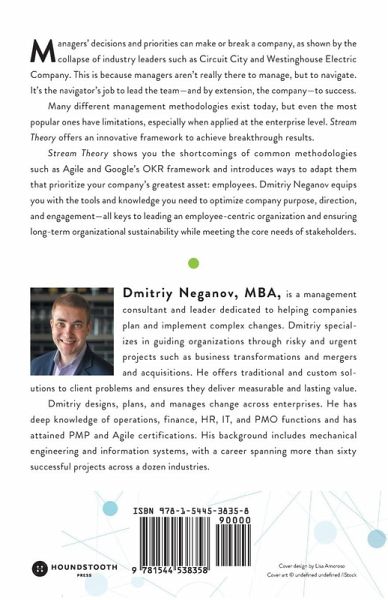 Managers' decisions and priorities can make or break a company, as shown by the collapse of industry leaders such as Circuit City and Westinghouse Electric Company. This is because managers aren't really there to manage, but to navigate. It's the navigator's job to lead the team-and by extension, the company-to success. Many different management methodologies exist today, but even the most popular ones have limitations, especially when applied at the enterprise level. Stream Theory offers an innovative framework to achieve breakthrough results. ¿ Stream Theory shows you the shortcomings of common methodologies such as Agile and Google's OKR framework and introduces ways to adapt them that prioritizes your company's greatest asset: employees. Dmitriy Neganov equips you with the tools and knowledge you need to optimize company purpose, direction, and engagement-all keys to leading an employee-centric organization and ensuring long-term organizational sustainability while meeting the core needs of stakeholders.