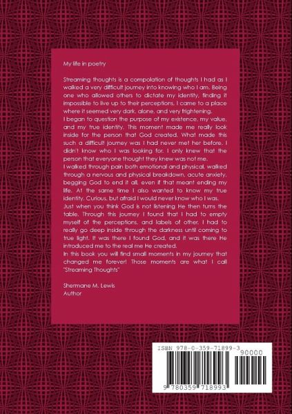 This compolation of pieces represents moments in my journey to self discovery where there was confusion, pain, questions, and resolve. Though it was a very painful experience, accompanied by a constant feeling of emptiness, I would not want to go back to being only the creation of others, and not the creation my creator intended. I am now the person that I was meant to be. Now that I am home (myself) I have learned to relax, breath, and pursue living with purpose. Though challenges come at times, I am at peace with me. Now I know what it is like to be ME!