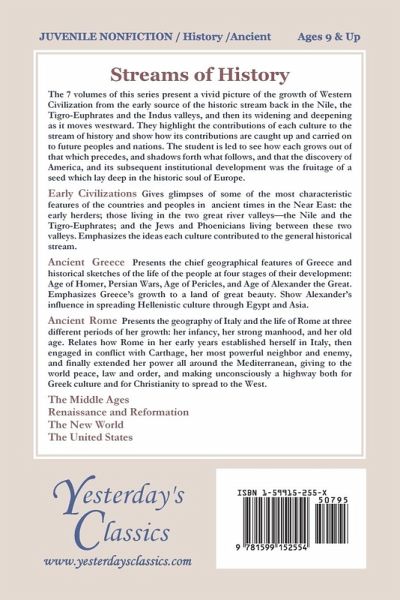 Presents the chief geographical features of Greece and historical sketches of the life of the people at four stages of their development: Age of Homer, Persian Wars, Age of Pericles, and Age of Alexander the Great. Emphasizes Greece's growth to a land of great beauty. Show Alexander's influence in spreading Hellenistic culture through Egypt and Asia. Volume 2 in the 7-volume Streams of History series, which presents a vivid picture of the growth of Western Civilization from the early source of the historic stream back in the Nile, the Tigro-Euphrates and the Indus valleys, and then its widening and deepening as it moves westward. The series highlights the contributions of each culture to the stream of history and shows how its contributions are caught up and carried on to future peoples and nations. The student is led to see how each grows out of that which precedes, and shadows forth what follows, and that the discovery of America, and its subsequent institutional development was the fruitage of a seed which lay deep in the historic soul of Europe.