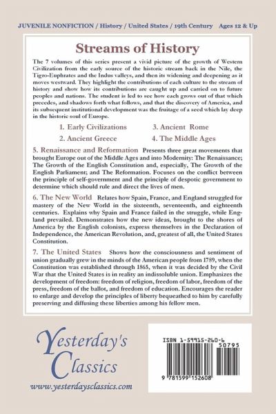 Shows how the consciousness and sentiment of union gradually grew in the minds of the American people from 1789, when the Constitution was established through 1865, when it was decided by the Civil War that the United States is in reality an indissoluble union. Emphasizes the development of freedom: freedom of religion, freedom of labor, freedom of the press, freedom of the ballot, and freedom of education. Encourages the reader to enlarge and develop the principles of liberty bequeathed to him by carefully preserving and diffusing these liberties among his fellow men. Volume 7 in the 7-volume Streams of History series, which presents a vivid picture of the growth of Western Civilization from the early source of the historic stream back in the Nile, the Tigro-Euphrates and the Indus valleys, and then its widening and deepening as it moves westward. The series highlights the contributions of each culture to the stream of history and shows how its contributions are caught up and carried on to future peoples and nations. The student is led to see how each grows out of that which precedes, and shadows forth what follows, and that the discovery of America, and its subsequent institutional development was the fruitage of a seed which lay deep in the historic soul of Europe. Suitable for ages 12 and up.