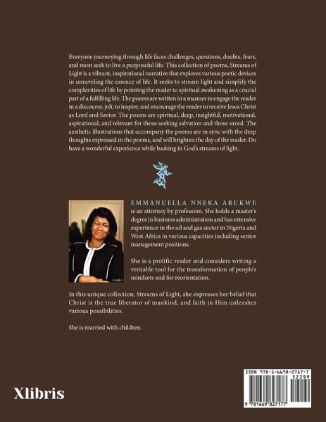 Everyone journeying through life faces challenges, questions, doubts, fears, and most seek to live a purposeful life. This collection of poems, Streams of Light is a vibrant, inspirational narrative that explores various poetic devices in unraveling the essence of life. It seeks to stream light and simplify the complexities of life by pointing the reader to spiritual awakening as a crucial part of a fulfilling life. The poems are written in a manner to engage the reader in a discourse, jolt, to inspire, and encourage the reader to receive Jesus Christ as Lord and Savior. The poems are spiritual, deep, insightful, motivational, aspirational, and relevant for those seeking salvation and those saved. The aesthetic illustrations that accompany the poems are in sync with the deep thoughts expressed in the poems, and will brighten the day of the reader. Do have a wonderful read while basking in God's streams of light.