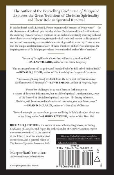 The author of the bestselling celebration of discipline explores the great traditions of Christian spirituality and their role in spiritual renewal today. In this landmark work, Foster examines the "streams of living water" -- the six dimensions of faith and practice that define Christian tradition. He lifts up the enduring character of each tradition and shows how a variety of practices, from individual study and retreat to disciplines of service and community, are all essential elements of growth and maturity. Foster examines the unique contributions of each of these traditions and offers as examples the inspiring stories of faithful people whose lives defined each of these "streams."