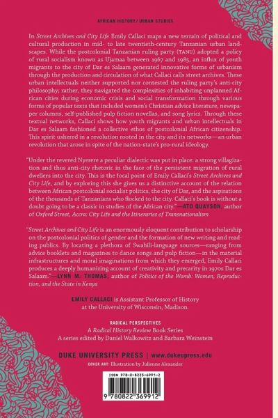 In Street Archives and City Life Emily Callaci maps a new terrain of political and cultural production in mid- to late twentieth-century Tanzanian urban landscapes. While the postcolonial Tanzanian ruling party (TANU) adopted a policy of rural socialism known as Ujamaa between 1967 and 1985, an influx of youth migrants to the city of Dar es Salaam generated innovative forms of urbanism through the production and circulation of what Callaci calls street archives. These urban intellectuals neither supported nor contested the ruling party's anti-city philosophy; rather, they navigated the complexities of inhabiting unplanned African cities during economic crisis and social transformation through various forms of popular texts that included women's Christian advice literature, newspaper columns, self-published pulp fiction novellas, and song lyrics. Through these textual networks, Callaci shows how youth migrants and urban intellectuals in Dar es Salaam fashioned a collective ethos of postcolonial African citizenship. This spirit ushered in a revolution rooted in the city and its networks-an urban revolution that arose in spite of the nation-state's pro-rural ideology.