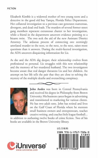 Elizabeth Kimble is a widowed mother of two young teens and a detective in the good old boy Tampa, Florida Police Department. Her collateral investigation to a previous case generates numerous, divergent, and dead end leads. The murders of several former street gang members represent extraneous chatter to her investigation, while a friend in the department uncovers evidence pointing to a bizarre twist. The two seek the aid of the new Assistant District Attorney. The arduous process of connecting one seemingly unrelated murder to the next, to the next, to the next, raises more questions than it answers. During the multi-faceted investigation, the ADA uncovers disquieting information for Liz. As she and the ADA dig deeper, their relationship evolves from professional to personal. Liz struggles with this new relationship and the memory of her murdered husband. The two investigators become aware that real danger threatens Liz and her children. An attempt on her life tells the pair that they are close to solving the mystery of the multiple deaths and overarching conspiracy.