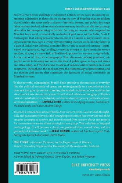 Street Corner Secrets challenges widespread notions of sex work in India by examining solicitation in three spaces within the city of Mumbai that are seldom placed within the same analytic frame-brothels, streets, and public day-wage labor markets (nakas), where sexual commerce may be solicited discretely alongside other income-generating activities. Focusing on women who migrated to Mumbai from rural, economically underdeveloped areas within India, Svati P. Shah argues that selling sexual services is one of a number of ways women working as laborers may earn a living, demonstrating that sex work, like day labor, is a part of India's vast informal economy. Here, various means of earning-legitimized or stigmatized, legal or illegal-overlap or exist in close proximity to one another, shaping a narrow field of livelihood options that women navigate daily. In the course of this rich ethnography, Shah discusses policing practices, migrants' access to housing and water, the idea of public space, critiques of states and citizenship, and the discursive location of violence within debates on sexual commerce. Throughout, the book analyzes the epistemology of prostitution, and the silences and secrets that constitute the discourse of sexual commerce on Mumbai's streets.