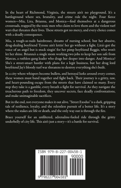 In the heart of Richmond, Virginia, the streets ain't no playground. It's a battleground where sex, brutality, and crime rule the night. Four fierce women-Mia, Lira, Brianna, and Monica-find themselves at a dangerous crossroads, trapped by the toxic men who claim to love them and the violent turf wars that threaten their lives. These streets got no mercy, and every choice comes with a deadly consequence. Mia, a tough-as-nails hairdresser, dreams of nursing school, but her abusive, drug-dealing boyfriend Tyrone ain't lettin' her go without a fight. Lira's got the voice of an angel but is stuck singin' for her pimp boyfriend Reggie, who won't let her shine. Brianna's a single mom working two jobs to keep her son safe from Marcus, a ruthless gang leader who drags her deeper into danger. And Monica? She's a street-smart hustler with plans for a legit business, but her drug lord boyfriend Jay's bloody turf war threatens to destroy everything she's built. In a city where whispers become bullets, and betrayal lurks around every corner, these women must band together and fight back. Their journey is a gritty, raw, and heart-pounding escape from the streets that have claimed so many. Every step they take is a gamble, every breath a fight for survival. As they navigate the treacherous path to freedom, they uncover secrets, face deadly confrontations, and make unimaginable sacrifices. But in the end, not everyone makes it out alive. "Street Exodus" is a dark, gripping tale of resilience, loyalty, and the relentless pursuit of a better life. It's a story where the stakes are life or death, and the only way out is through the fire. Brace yourself for an unfiltered, adrenaline-fueled ride through the gritty underbelly of city life. This ain't just a story-it's a battle for survival.