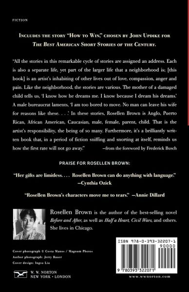 "All the stories in this remarkable cycle of stories are assigned an address. Each is also a separate life, yet part of the larger life that a neighborhood is; [this book] is an artist's inhabiting of other lives out of love, compassion, anger, and pain. Like the neighborhood, the stories are various. The mother of a damaged child tells us, 'I know how he dreams me. I know because I dream his dreams.' A male bureaucrat laments, 'I am too bored to move. No man can leave his wife for reasons like these....' In these stories, Rosellen Brown is Anglo, Puerto Rican, African American, Caucasian, male, female, parent, child. That is the artist's responsibility, the being of so many. Furthermore, it is a brilliantly written book that, in a period of fiction sniffing and snorting at itself, reminds us how the first rate will not go away."-from the foreword by Frederick Busch