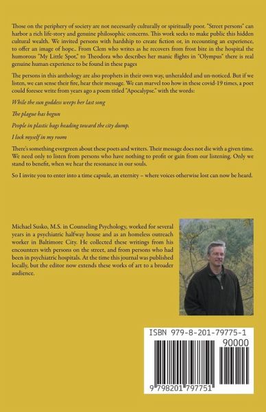 Those on the periphery of society are not necessarily culturally or spiritually poor. "Street persons" can harbor a rich life-story and genuine philosophic concerns. This work seeks to make public this hidden cultural wealth. We invited persons with hardship to create fiction or, in recounting an experience, to offer an image of hope.. From Clem who writes as he recovers from frost bite in the hospital the humorous "My Little Spot," to Theodora who describes her manic flights in "Olympus" there is real genuine human experience to be found in these pages The persons in this anthology are also prophets in their own way, unheralded and un-noticed. But if we listen, we can sense their fire, hear their message. We can marvel too how in these covid-19 times, a poet could foresee write from years ago a poem titled "Apocalypse." with the words: While the sun goddess weeps her last song The plague has begun People in plastic bags heading toward the city dump. I lock myself in my room There's something evergreen about these poets and writers. Their message does not die with a given time. We need only to listen from persons who have nothing to profit or gain from our listening. Only we stand to benefit, when we hear the resonance in our souls. So I invite you to enter into a time capsule, an eternity – where voices otherwise lost can now be heard.
