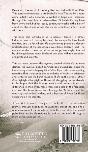 Unraveling the Mystery of Michelle 'Max' Thorndike: A Journey Through Street Life, Deceit, and Divine Guidance. A Hopeful Tale To Empower Homeless Youth. Venture into the shadowy world of homeless youth in the poignant and enlightening Street Kids. Michelle 'Max' Thorndike, once a mere name in passing, becomes a beacon of hope and a symbol of resilience as the narrative unfolds. Her life may have been cut short, but her story continues to resonate, pushing the boundaries of our understanding of life on the streets. Michelle's journey is intricately woven with the lives of other street kids, each with their own unique, yet interconnected story. Among them, Stonie 'Horsshit', who fakes his death to escape the harsh realities of the street, and JaiJai, whose life events provide a deeper insight into the precarious existence these youths face. These narratives intertwine in a divine tapestry, seemingly guided by a higher power, delivering each story at the precise moment it is needed to keep the book alive and pulsating with raw emotion. Witness the unraveling of the mystery surrounding Michelle's death, the deceit embedded in Stonie's faked demise, and the life-changing events that have sculpted JaiJai's existence. In this narrative, you will discover how these seemingly unconnected threads converge, forming a compelling story that transcends the boundaries of ordinary life. Street Kids shines a light on those still struggling on the streets, left to fend for themselves in an unforgiving world. It prompts a sense of urgency and hope, with a fervent wish that this literary piece will make a difference in their lives. This is not just a story about the forgotten youths of our society, but also a canvas upon which their hopes, dreams, and struggles are etched in vivid detail. In the end, you'll find that this book is more than just a tale of street kids. It's a beacon of hope for those lost and forgotten, a solemn tribute to Michelle, and an urgent call for compassion and understanding. This is a journey through street life, deceit, divine guidance, and a hopeful tale to empower homeless youth. Experience the profound and transformative power of this narrative, and may it inspire you to view the world with a more compassionate lens.