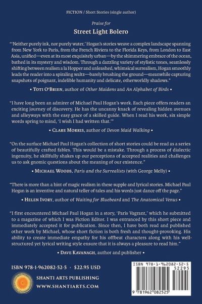 Born in London, Michael Paul Hogan is a poet, journalist, literary essayist, and fiction writer whose work has appeared extensively in the UK, USA, India, and China. He has published six books of poetry and numerous articles on contemporary literature, photography, and painting in both mainstream and independent magazines. Brought up in England and Wales, he has lived in Key West, India, Sumatra, Java, Thailand, and China, and to support himself during periods of working on experimental poetry and prose has variously sought employment as a commercial fisherman, house painter, bartender, day laborer, radio announcer, and market stall trader. Artist Descending a Typewriter: 9 Essays on Contemporary Art, endorsed by Viscountess Bridgeman as "An original and exceptional contribution to contemporary art history," was published by Shanti Arts in 2023. Street Light Bolero is his first collection of short stories.