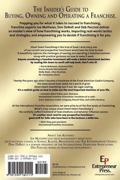 THE INSIDER'S GUIDE TO BUYING, OWNING AND OPERATING A FRANCHISE. Prepping you for what it takes to succeed in franchising, franchise experts Joe Mathews, Don DeBolt and Deb Percival deliver an insider's view of how franchising works, imparting real-world tactics and strategies, and empowering you to decide if franchising is for you. Street Smart Franchising is the kind of book I wish every one of our current and prospective franchisees would take the time to read. It beautifully captures the challenges of owning and operating a franchise business along with practical guidance on how to make it work. Anyone considering a franchise investment will make a better investment decision by reading this down-to-earth self help book. Don't miss it!" -- David McKinnon, chairman/CEO, Service Brands International:Molly Maid, 1-800 Dryclean, Mr. Handyman, Ductz "Twenty-five years ago when I became a franchisee of the Great American Cookie Company, this book would have saved me a world of grief. Street Smart Franchising lays it out. No sugar coating. It's a realistic guide on how to make one the most important decisions of your life." -- Lawrence (Doc) Cohen, past chairman, International Franchise Association, franchisee of 21 units - Great American Cookie Company, Pretzel Time, and Coffee Beanery. "At the International Franchise Association, we were privy to all the fine books on franchising. What's truly unique about Street Smart Franchising is the carefully crafted treatment of how emotions and behavior influence success. It's another must read for any prospective franchisee--good stuff for folks who have been in the business a while too." -- Matt Shay, past president,International Franchise Association Joe Mathews has held management roles with such national chains as Subway, Blimpie, Motophoto and the Entrepreneur's Source. Don DeBolt is a former president of the International Franchise Association. Deb Percival works in franchise development.