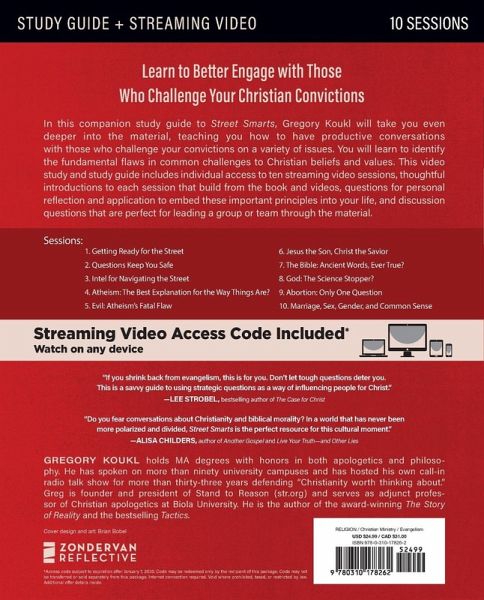Building on Street Smarts, this study guide by Gregory Koukl will take you deeper, teaching you the strategies for productive conversations with those who challenge your convictions on a variety of issues. The focus is on revealing the fundamental flaws in common, current challenges to Christian beliefs and values. It then provides individual strategies to exploit those shortcomings by offering model questions and sample dialogues to help guide believers in genial, yet persuasive, conversations. This study guide has everything you need for a full personal or group experience. * The study guide itself--with thoughtful introductions, questions for personal reflection and application, and discussion questions for leading a group or team. * An individual access code to stream all video sessions online. (You don't need to buy a DVD!) Sessions and video run times: 1 - Getting Ready for the Street (33 min) 2 - Questions Keep You Safe (34 min) 3 - Intel for Navigating the Street (23 min) 4 - Atheism: The Best Explanation for the Way Things Are? (37 min) 5 - Evil: Atheism's Fatal Flaw (29 min) 6 - Jesus the Son, Christ the Savior (32 min) 7 - The Bible: Ancient Words, Ever True? (24 min) 8 - God: The Science Stopper? (29 min) 9 - Abortion: Only One Question (41 min) 10 - Marriage, Sex, Gender, and Common Sense (41 min) Streaming video access code included. Access code subject to expiration after [insert 5 years after OSD]. Code may be redeemed only by the recipient of this package. Code may not be transferred or sold separately from this package. Internet connection required. Void where prohibited, taxed, or restricted by law. Additional offer details inside.