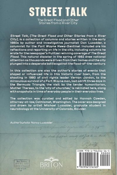 Street Talk, (The Great Flood and Other Stories from a River City), is a collection of columns and stories written in the early 1980s by author and investigative journalist Dan Luzadder, a columnist for the Fort Wayne News-Sentinel. Included are his reflections and reporting on life in the city, including columns he wrote for the newspaper's Pulitzer-winning coverage of The Great Flood. This natural disaster in the spring of 1982 drew national attention and an appearance by President Ronald Reagan as thousands of residents were driven from their homes at the heart of the city where three rivers converge - and the city plunged into a desperate battle against the flood-of-the-century. Also in this collection are the author's stories of news events that shape or influenced life in an historic river town. His accounts range from the shooting there in 1980 of civil rights leader Vernon Jordan, to his chronicle of the miraculous survival of a Fort Wayne man, lost adrift for three days in a lifejacket in the Bermuda Triangle. The author's story of a visit by the tender humanitarian Mother Theresa to this 'city of churches,' is rekindled here, along with tales of everyday people in their everyday lives, snapshots of a time and place. The News-Sentinel, an afternoon newspaper for which the author worked before moving on to investigative reporting and freelance writing, is also a part of the city's history now, succumbing to the decline of the newspaper industry under a changing communications landscape, the death of an institution that generated living history for more than 150 years. This collection was selected and edited by Hannah Cowden, attorney, Cathlamet, Washington. The cover was designed and drawn by artist Michael Luzadder, a graduate student in neurobiology at the University of Colorado Boulder. The writer of Street Talk is also author of The Manchurian Journalist: Lawrence Wright, the CIA, and the Corruption of American Journalism, released by Trine Day in 2024.