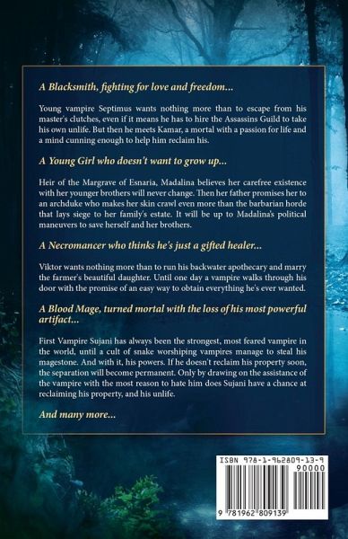 A Blacksmith, fighting for love and freedom... Young vampire Septimus wants nothing more than to escape from his master's clutches, even if it means he has to hire the Assassins Guild to take his own unlife. But then he meets Kamar, a mortal with a passion for life and a mind cunning enough to help him reclaim his. A Young Girl who doesn't want to grow up... Heir of the Margrave of Esnaria, Madalina believes her carefree existence with her younger brothers will never change. Then her father promises her to an archduke who makes her skin crawl even more than the barbarian horde that lays siege to her family's estate. It will be up to Madalina's political maneuvers to save herself and her brothers. A Necromancer who thinks he's just a gifted healer... Viktor wants nothing more than to run his backwater apothecary and marry the farmer's beautiful daughter. Until one day a vampire walks through his door with the promise of an easy way to obtain everything he's ever wanted. A Blood Mage, turned mortal with the loss of his most powerful artifact... First Vampire Sujani has always been the strongest, most feared undead in the world, until a cult of snake worshiping vampires manage to steal his magestone. And with it, his powers. If he doesn't reclaim his property soon, the separation will become permanent. Only by drawing on the assistance of the person with the most reason to hate him does Sujani have a chance at reclaiming his property, and his unlife. And many more...