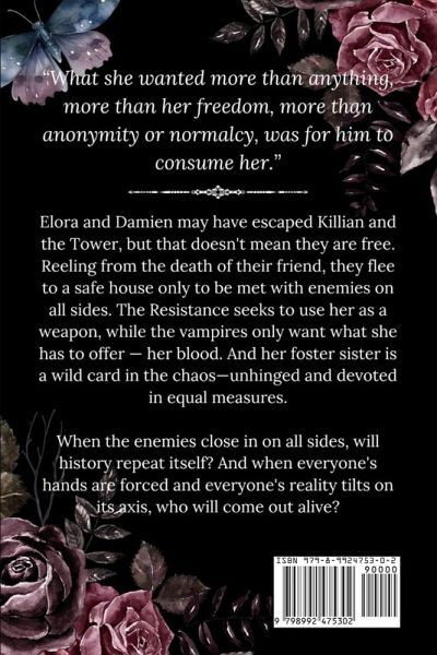 "All she wanted was for it all to burn to the ground so she could dance on what was left. She would destroy the world if it meant they begged for mercy, pleaded for her to stop." Elora and Damien may have escaped Killian and the Tower, but that doesn't mean they are free. Reeling from the death of their friend, they flee to a safe house only to be met with enemies on all sides. The Resistance seeks to use her as a weapon, while the vampires only want what she has to offer - her blood. They want her to fulfill the role her father created her for. And her foster sister is a wild card in the chaos-unhinged and devoted in equal measures. In the midst of the ensuing hunt, Elora's uncle seeks her out and offers her protection and knowledge while Damien struggles with not only the world he knew but also his growing obsession with the vampire he helped rescue. When the enemies close in on all sides, will Elora allow them to protect her? Or will history repeat itself? And when everyone's hands are forced and everyone's reality tilts on its axis, who will come out alive and how much pain will they endure?