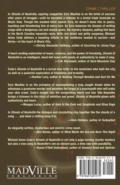 "In Streets of Nashville, Ezra MacRae has a nearly encyclopedic knowledge of songs and their writers, and he has moved from the North Carolina mountains to Nashville's Music Row with the dream of becoming part of that songwriting world. Yet just as he is out on the town to celebrate his first good fortune after several years of trying--a staff songwriting contract with an independent music publisher--he witnesses the man who signed on the dotted lines with him gunned down with three others outside his Music Row office. The masked gunman spares Ezra. But why?"--