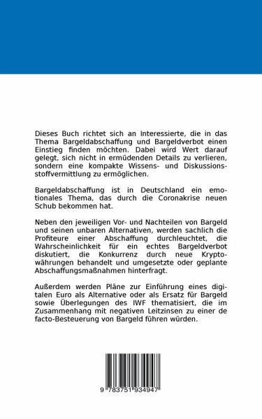 Dieses Buch richtet sich an Interessierte, die in das Thema Bargeldabschaffung und Bargeldverbot einen Einstieg finden möchten. Dabei wird Wert darauf gelegt, sich nicht in ermüdenden Details zu verlieren, sondern eine kompakte Wissens- und Diskussionsstoffvermittlung zu ermöglichen. Bargeldabschaffung ist in Deutschland ein emotionales Thema, das durch die Coronakrise neuen Schub bekommen hat. Neben den jeweiligen Vor- und Nachteilen von Bargeld und seinen unbaren Alternativen werden sachlich die Profiteure einer Abschaffung durchleuchtet, die Wahrscheinlichkeit für ein echtes Bargeldverbot diskutiert, die Konkurrenz durch neue Kryptowährungen behandelt und umgesetzte oder geplante Abschaffungsmaßnahmen hinterfragt. Außerdem werden Pläne zur Einführung eines digitalen Euro als Alternative oder als Ersatz für Bargeld sowie Überlegungen des IWF thematisiert, die im Zusammenhang mit negativen Leitzinsen zu einer de facto-Besteuerung von Bargeld führen würden.