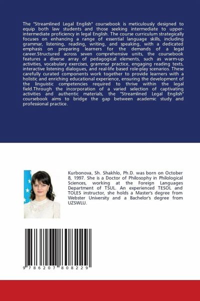 The "Streamlined Legal English" coursebook is meticulously designed to equip both law students and those seeking intermediate to upper-intermediate proficiency in legal English. The course curriculum strategically focuses on enhancing a range of essential language skills, including grammar, listening, reading, writing, and speaking, with a dedicated emphasis on preparing learners for the demands of a legal career.Structured across seven comprehensive units, the coursebook features a diverse array of pedagogical elements, such as warm-up activities, vocabulary exercises, grammar practice, engaging reading texts, interactive listening dialogues, and real-life based role-play scenarios. These carefully curated components work together to provide learners with a holistic and enriching educational experience, ensuring the development of the linguistic competencies required to thrive within the legal field.Through the incorporation of a varied selection of captivating activities and authentic materials, the "Streamlined Legal English" coursebook aims to bridge the gap between academic study and professional practice.