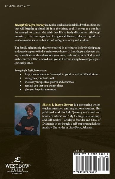 Strength for Life’s Journey is a twelve-week devotional filled with meditations that will breathe spiritual life into the thirsty soul. It serves as a conduit for strength to combat the trials that life so freely distributes. Although uninvited, trials come regardless of religious affiliations, titles, race, gender, or socioeconomic status — but so do God’s grace, mercy and wisdom. The family relationship that once existed in the church is slowly dissipating and people appear to find it easier to stay home. It is my hope and prayer that as you meditate on these devotions your hope, faith, and trust in God, as well as the church, will be renewed, and you will receive strength to complete your spiritual journey. Strength for Life’s Journey can: help you embrace God’s strength in good, as well as difficult times strengthen your faith-walk increase your spiritual growth and awareness remind you that you are not alone give you hope for tomorrow