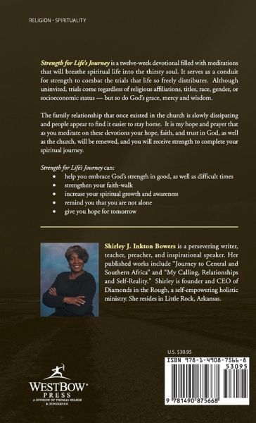 Strength for Life's Journey is a twelve-week devotional filled with meditations that will breathe spiritual life into the thirsty soul. It serves as a conduit for strength to combat the trials that life so freely distributes. Although uninvited, trials come regardless of religious affiliations, titles, race, gender, or socioeconomic status - but so do God's grace, mercy and wisdom. The family relationship that once existed in the church is slowly dissipating and people appear to find it easier to stay home. It is my hope and prayer that as you meditate on these devotions your hope, faith, and trust in God, as well as the church, will be renewed, and you will receive strength to complete your spiritual journey. Strength for Life's Journey can: help you embrace God's strength in good, as well as difficult times strengthen your faith-walk increase your spiritual growth and awareness remind you that you are not alone give you hope for tomorrow