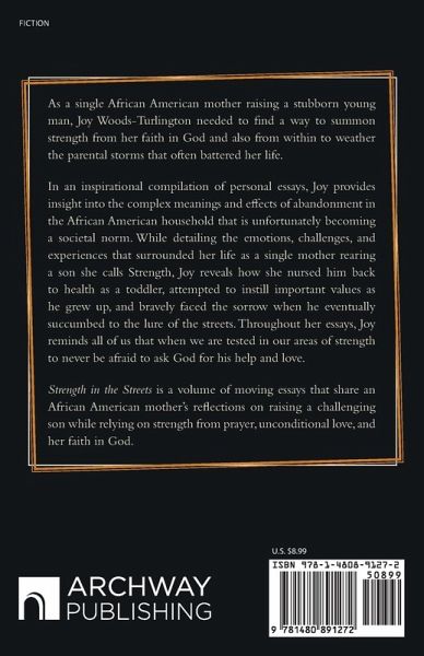 As a single African American mother raising a stubborn young man, Joy Woods-Turlington needed to find a way to summon strength from her faith in God and also from within to weather the parental storms that often battered her life. In an inspirational compilation of personal essays, Joy provides insight into the complex meanings and effects of abandonment in the African American household that is unfortunately becoming a societal norm. While detailing the emotions, challenges, and experiences that surrounded her life as a single mother rearing a son she calls Strength, Joy reveals how she nursed him back to health as a toddler, attempted to instill important values as he grew up, and bravely faced the sorrow when he eventually succumbed to the lure of the streets. Throughout her essays, Joy reminds all of us that when we are tested in our areas of strength to never be afraid to ask God for his help and love. Strength in the Streets is a volume of moving essays that share an African American mother's reflections on raising a challenging son while relying on strength from prayer, unconditional love, and her faith in God.
