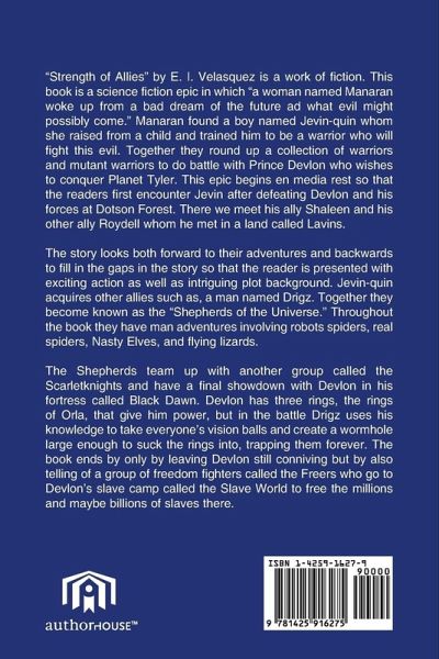 "Strength of Allies" by E. I. Velasquez is a work of fiction. This book is a science fiction epic in which "a woman named Manaran woke up from a bad dream of the future ad what evil might possibly come." Manaran found a boy named Jevin-quin whom she raised from a child and trained him to be a warrior who will fight this evil. Together they round up a collection of warriors and mutant warriors to do battle with Prince Devlon who wishes to conquer Planet Tyler. This epic begins en media rest so that the readers first encounter Jevin after defeating Devlon and his forces at Dotson Forest. There we meet his ally Shaleen and his other ally Roydell whom he met in a land called Lavins. The story looks both forward to their adventures and backwards to fill in the gaps in the story so that the reader is presented with exciting action as well as intriguing plot background. Jevin-quin acquires other allies such as, a man named Drigz. Together they become known as the "Shepherds of the Universe." Throughout the book they have man adventures involving robots spiders, real spiders, Nasty Elves, and flying lizards. The Shepherds team up with another group called the Scarletknights and have a final showdown with Devlon in his fortress called Black Dawn. Devlon has three rings, the rings of Orla, that give him power, but in the battle Drigz uses his knowledge to take everyone's vision balls and create a wormhole large enough to suck the rings into, trapping them forever. The book ends by only by leaving Devlon still conniving but by also telling of a group of freedom fighters called the Freers who go to Devlon's slave camp called the Slave World to free the millions and maybe billions of slaves there.