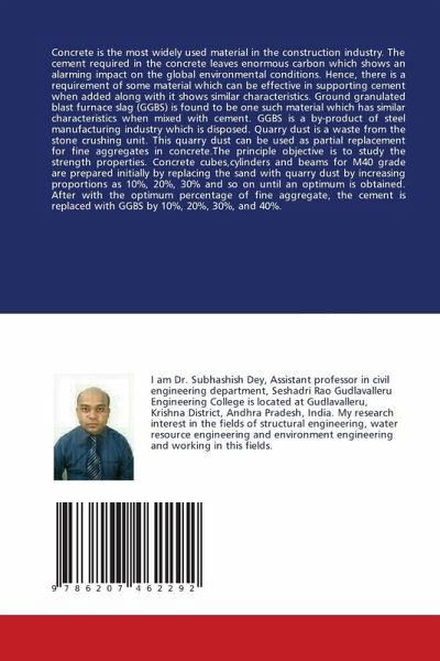 Concrete is the most widely used material in the construction industry. The cement required in the concrete leaves enormous carbon which shows an alarming impact on the global environmental conditions. Hence, there is a requirement of some material which can be effective in supporting cement when added along with it shows similar characteristics. Ground granulated blast furnace slag (GGBS) is found to be one such material which has similar characteristics when mixed with cement. GGBS is a by-product of steel manufacturing industry which is disposed. Quarry dust is a waste from the stone crushing unit. This quarry dust can be used as partial replacement for fine aggregates in concrete.The principle objective is to study the strength properties. Concrete cubes,cylinders and beams for M40 grade are prepared initially by replacing the sand with quarry dust by increasing proportions as 10%, 20%, 30% and so on until an optimum is obtained. After with the optimum percentage of fine aggregate, the cement is replaced with GGBS by 10%, 20%, 30%, and 40%.
