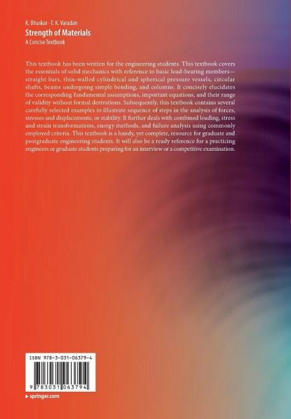 This textbook has been written for the engineering students. This textbook covers the essentials of solid mechanics with reference to basic load-bearing members-straight bars, thin-walled cylindrical and spherical pressure vessels, circular shafts, beams undergoing simple bending, and columns. It concisely elucidates the corresponding fundamental assumptions, important equations, and their range of validity without formal derivations. Subsequently, this textbook contains several carefully selected examples to illustrate sequence of steps in the analysis of forces, stresses and displacements, or stability. It further deals with combined loading, stress and strain transformations, energy methods, and failure analysis using commonly employed criteria. This textbook is a handy, yet complete, resource for graduate and postgraduate engineering students. It will also be a ready reference for a practicing engineers or graduate students preparing for an interview or a competitive examination.