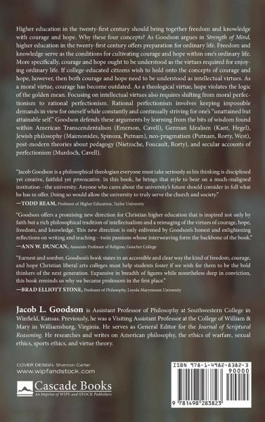 Higher education in the twenty-first century should bring together freedom and knowledge with courage and hope. Why these four concepts? As Goodson argues in Strength of Mind, higher education in the twenty-first century offers preparation for ordinary life. Freedom and knowledge serve as the conditions for cultivating courage and hope within one's ordinary life. More specifically, courage and hope ought to be understood as the virtues required for enjoying ordinary life. If college-educated citizens wish to hold onto the concepts of courage and hope, however, then both courage and hope need to be understood as intellectual virtues. As a moral virtue, courage has become outdated. As a theological virtue, hope violates the logic of the golden mean. Focusing on intellectual virtues also requires shifting from moral perfectionism to rational perfectionism. Rational perfectionism involves keeping impossible demands in view for oneself while constantly and continually striving for one's "unattained but attainable self." Goodson defends these arguments by learning from the bits of wisdom found within American Transcendentalism (Emerson, Cavell), German Idealism (Kant, Hegel), Jewish philosophy (Maimonides, Spinoza, Putnam), neo-pragmatism (Putnam, Rorty, West), post-modern theories about pedagogy (Nietzsche, Foucault, Rorty), and secular accounts of perfectionism (Murdoch, Cavell).