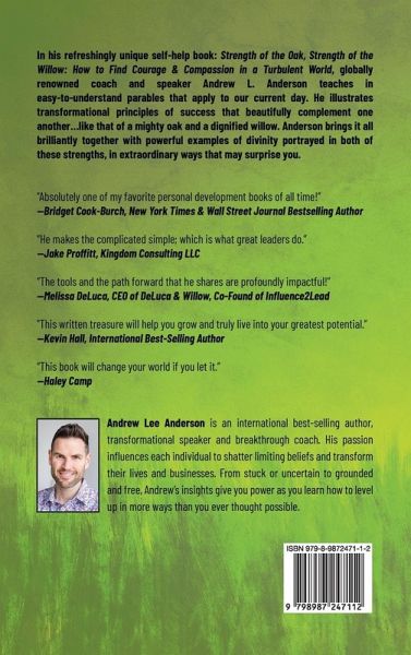 What has the modern world forgotten about real growth and lasting change? What if you were finally challenged in your life in a way that absolutely served you? In his refreshingly unique self-help book, Strength of the Oak, Strength of the Willow: How to Find Courage & Compassion in a Turbulent World, globally renowned coach Andrew L. Anderson teaches in easy-to-understand parables that apply to our current day. He illustrates transformational principles of success that beautifully complement one another...like that of a mighty oak and a dignified willow. Andrew brings it all brilliantly together with powerful examples of divinity portrayed in both of these strengths, in extraordinary ways that may surprise you. As you fully engage in this book, soaking in every ounce of applicable knowledge and wisdom through the empowering stories presented and the practical tools offered, you will walk away with a riveted courage, unlike any your heart has ever known. You will find uncommon compassion that will beckon you to lead, love and serve our bleeding world. A dormant, God-given power of personal freedom and potential that you've always longed for is awaiting you. Wherever you may stand on the multitude of life's never-ending journeys, embark on this inner adventure with yourself and see what's yearning to ignite. Let loose the Life Mission that's been calling you for far too long. Strength of the Oak, Strength of the Willow inspires the absolute best version of you that this world so desperately needs. It's time.