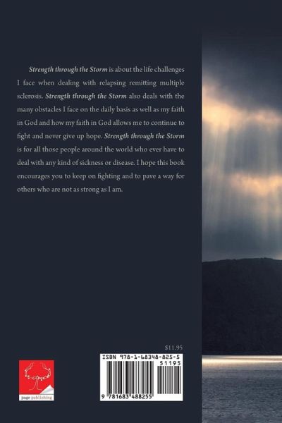 Strength through the Storm is about the life challenges I face when dealing with relapsing remitting multiple sclerosis. Strength through the Storm also deals with the many obstacles I face on the daily basis as well as my faith in God and how my faith in God allows me to continue to fight and never give up hope. Strength through the Storm is for all those people around the world who ever have to deal with any kind of sickness or disease. I hope this book encourages you to keep on fighting and to pave a way for others who are not as strong as I am.