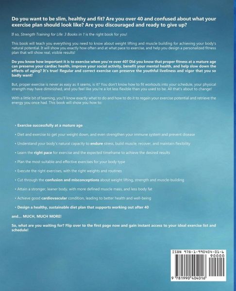 Do you want to be slim, healthy and fit? Are you over 40 and confused about what your exercise plan should look like? Are you discouraged and ready to give up? If so, Strength Training For Life is the perfect book for you! This book will teach you everything you need to know about weight lifting and muscle building for achieving your body's natural potential. It will show you exactly how often and at what pace to exercise, and help you design a personalized fitness plan that will show real, visible results! Do you know how important it is to exercise when you're over 40? Did you know that proper fitness at a mature age can preserve your cardiac health, improve your social activity, benefit your mental health, and help slow down the effects of aging? It's true! Regular and correct exercise can preserve the youthful liveliness and vigor that you so badly want! But, proper exercise is never as easy as it seems, is it? You don't know how to fit workouts into your schedule, your physical strength may have diminished, and you feel like you're a lot less flexible than you used to be. All that's about to change! With a little bit of learning, you'll know exactly what to do and how to do it to regain your exercise potential and retrieve the energy you once had. This book will show you how to: * Exercise successfully at a mature age * Diet and exercise to get your weight down, and even strengthen your immune system and prevent disease * Understand your body's natural capacity to endure stress, build muscle, recover, and maintain flexibility * Learn the right pace for exercise and the expected timeframe to achieve the desired results * Plan the most suitable and effective exercises for your body type * Cut through the confusion and misconceptions about weight lifting, strength and muscle-building * Attain a stronger, leaner body, with more defined muscle mass, and less body fat * Achieve good cardiovascular condition, leading to better health and well-being * Design a healthy, sustainable diet plan that supports working out after 40 and... MUCH, MUCH MORE! This book will show you how to overcome the common obstacles to exercising after 40. It will show you how to deal with stress, lack of energy, less flexibility, pain, and setbacks. You will learn how to adapt your workouts to avoid overstrain and injury, and so much more! It will help you set the right goals for your body and feel motivated start to finish! With this book, it will become crystal clear which exercises your body needs, how often to do them, how to do them and how to get ready, how to rest afterward to enhance your shape, and how to fit exercise into your busy schedule. This won't be yet another ambitious list of demanding exercises that will be out of your reach. This book is perfectly suited to the real-life needs of real-life people! So, what are you waiting for? Click "Buy Now" and gain instant access to your ideal exercise list and schedule! Find out the true properties and potentials of your body type, its unique dietary needs