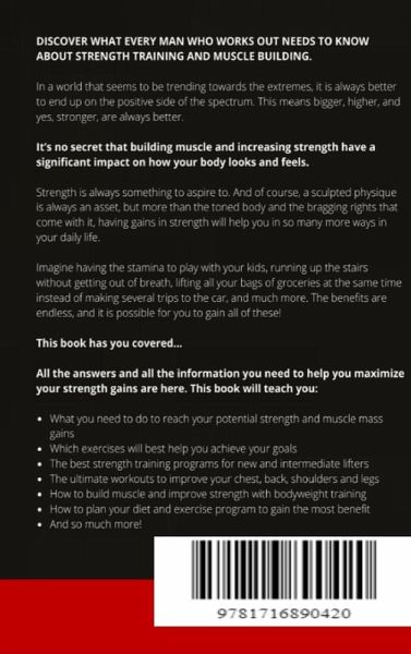 DISCOVER WHAT EVERY MAN WHO WORKS OUT NEEDS TO KNOW ABOUT STRENGTH TRAINING AND MUSCLE BUILDING. In a world that seems to be trending towards the extremes, it is always better to end up on the positive side of the spectrum. This means bigger, higher, and yes, stronger, are always better. It's no secret that building muscle and increasing strength have a significant impact on how your body looks and feels. Strength is always something to aspire to. And of course, a sculpted physique is always an asset, but more than the toned body and the bragging rights that come with it, having gains in strength will help you in so many more ways in your daily life. Imagine having the stamina to play with your kids, running up the stairs without getting out of breath, lifting all your bags of groceries at the same time instead of making several trips to the car, and much more. The benefits are endless, and it is possible for you to gain all of these! This book has you covered... All the answers and all the information you need to help you maximize your strength gains are here. This book will teach you: ¿ What you need to do to reach your potential strength and muscle mass gains ¿ Which exercises will best help you achieve your goals ¿ The best strength training programs for new and intermediate lifters ¿ The ultimate workouts to improve your chest, back, shoulders and legs ¿ How to build muscle and improve strength with bodyweight training ¿ How to plan your diet and exercise program to gain the most benefit ¿ And so much more! So what are you waiting for? If you want to know the right lifts and best strength training programs to follow... And are truly serious about building lean muscle and are prepared to make the commitment - then I think you should read this book. The time to start is NOW!