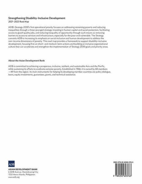 This road map will guide the Asian Development Bank (ADB) in strengthening its approach to disability-inclusive development. The publication sets out a practical route to greater disability inclusion in ADB projects, research, and organizational systems, focusing first on short- and medium-term actions. Its aims include supporting the active participation and empowerment of people with disabilities and increasing the capacity and knowledge of ADB staff. These activities will create the foundation for a more comprehensive and integrated approach to disability-inclusive development at ADB in the longer term and will support implementation of the bank's corporate Strategy 2030 across operational priorities.